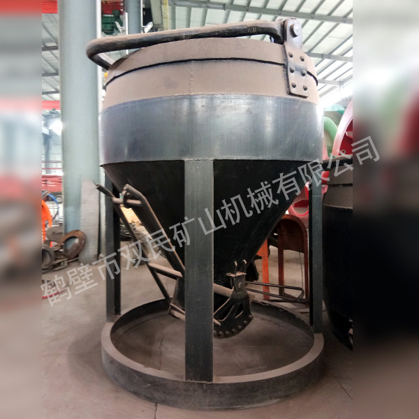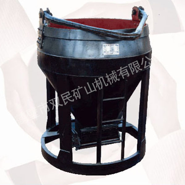 底部卸料斗由電力機車或其他牽引方式放置在平礦車上,位于井口棚與混凝土攪拌站之間。鏟斗由斗體、斗梁、扇門、閘門啟閉手柄和鎖緊機構(gòu)組成。礦斗是豎井開挖中提升矸石、提升人員和物料的主要容器。當井筒涌水量小于6M3/h時,也可用于排水。根據(jù)卸矸石形式的不同,斗分為鉤斗、鉤斗。