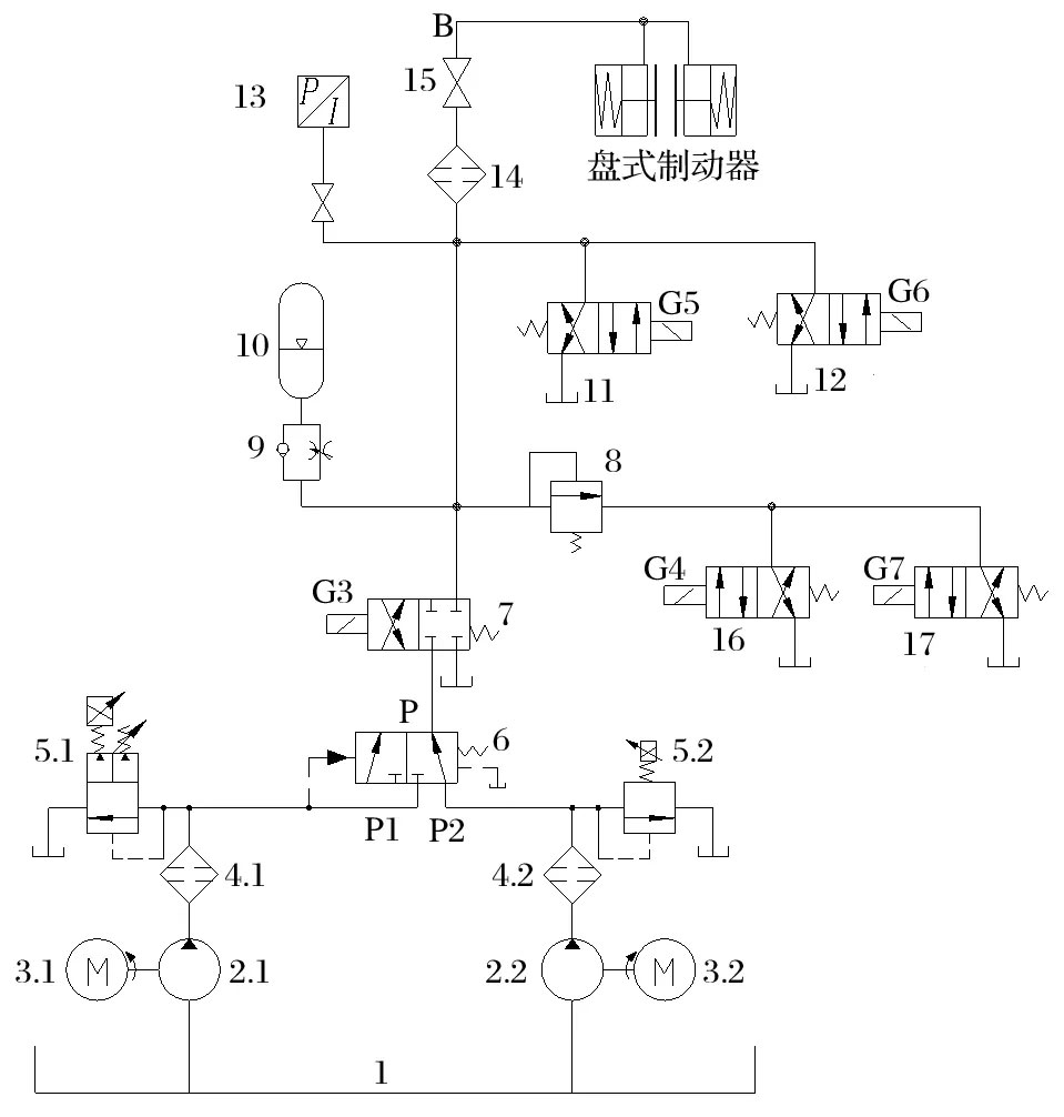 液壓站可以為盤式制動器提供不同油壓的壓力油,油壓的變化由電液比例溢流閥來調(diào)節(jié)。制動系統(tǒng)正常工作時,電動機(jī) 3.1 通電,電磁鐵 G3、G4、G5、G6、G7 得電,液壓泵 2.1 的壓力油經(jīng)過過濾器4.1、液動換向閥 6、電磁換向閥 7、過濾器 14、球閥15 和出油口 B 進(jìn)入盤式制動器。司機(jī)可以通過調(diào)節(jié)比例溢流閥 5.1 的比例電磁鐵,以控制電壓實現(xiàn)油壓的變化,從而達(dá)到調(diào)節(jié)制動力矩的目的。當(dāng)控制電壓增加時,系統(tǒng)油壓升高,制動器開閘;當(dāng)控制電壓減小時,制動系統(tǒng)油壓下降,制動器合閘;當(dāng)控制電壓減小至零時,制動系統(tǒng)的油壓很低,降為殘壓,提升機(jī)處于完全制動狀態(tài)。