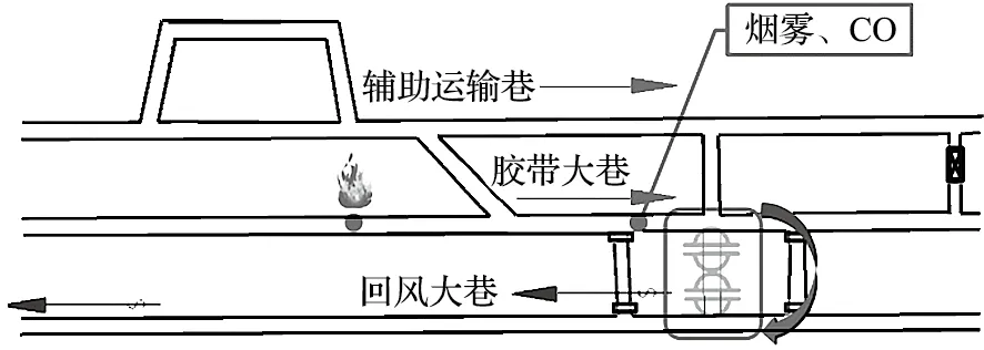 3.3.2 開(kāi)拓大巷災(zāi)變條件下優(yōu)化方案 當(dāng)開(kāi)拓大巷某一地點(diǎn)發(fā)生火災(zāi)等事故時(shí),由于明火存在火風(fēng)壓,在自然通風(fēng)條件下,明火與有毒有害氣體會(huì)隨風(fēng)流向下游區(qū)域蔓延。為準(zhǔn)確監(jiān)測(cè)災(zāi)變后的氣體特征,需要安裝煙霧和 CO 報(bào)警傳感器。當(dāng)監(jiān)測(cè)氣樣指標(biāo)超限時(shí),系統(tǒng)自動(dòng)打開(kāi)膠回聯(lián)巷處的 2 道風(fēng)門(mén),實(shí)現(xiàn)局部巷道的風(fēng)流短路,改變供風(fēng)方向,切斷向下游蔓延的氣體擴(kuò)散通道,從而達(dá)到保護(hù)下風(fēng)側(cè)作業(yè)人員生命安全的效果。風(fēng)流短路調(diào)控路線如圖5所示。