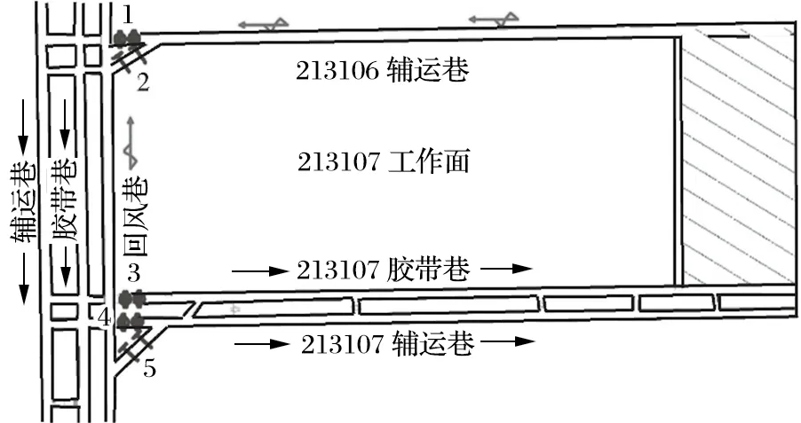以213107 工作面為例,分別在 213106 輔運(yùn)巷安裝 2 道風(fēng)門(mén),213107 膠帶巷安裝 1 道風(fēng)門(mén),在 213107輔運(yùn)巷及專(zhuān)回各安裝 1 道風(fēng)門(mén)。采煤工作面風(fēng)流優(yōu)化系統(tǒng)如圖4 所示。其中編號(hào) 1、3、4 為自吸風(fēng)門(mén);編號(hào) 2、5 為自調(diào)節(jié)風(fēng)門(mén)。正常通風(fēng)時(shí),打開(kāi) 2、3、4 等風(fēng)門(mén),形成 U 形全負(fù)壓通風(fēng),關(guān)閉 1、5 風(fēng)門(mén)形成閉合回路;發(fā)生災(zāi)變需要反風(fēng)時(shí),則打開(kāi)關(guān)閉的 1、5風(fēng)門(mén),形成風(fēng)向逆流,由 1 號(hào)風(fēng)門(mén)進(jìn)風(fēng),5 號(hào)風(fēng)門(mén)回風(fēng),其余 2、3、4 號(hào)風(fēng)門(mén)關(guān)閉,可實(shí)現(xiàn)反風(fēng)效果。