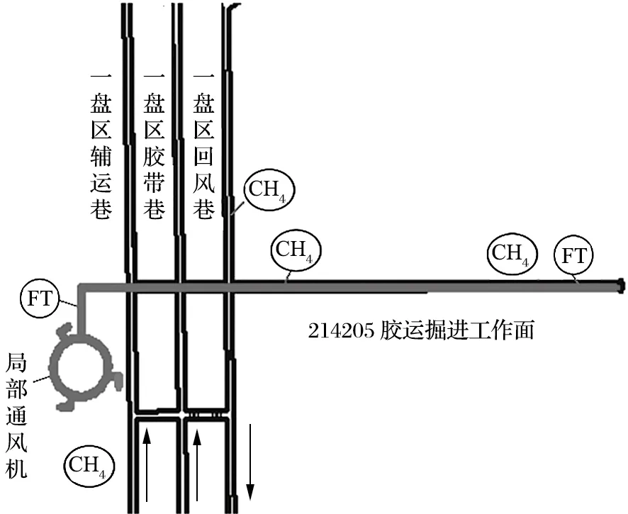 3.3.3 掘進(jìn)工作面優(yōu)化方案 在掘進(jìn)工作面新鮮風(fēng)流進(jìn)風(fēng)側(cè)安裝有 2 臺(tái)變頻軸流式局部通風(fēng)機(jī),在巷道風(fēng)門(mén)里正頭、專(zhuān)回口安裝有甲烷傳感器。對(duì)風(fēng)筒安裝風(fēng)壓傳感器,結(jié)合掘進(jìn)期間實(shí)際瓦斯涌出量和濃度指標(biāo),系統(tǒng)自行計(jì)算供風(fēng)量是否滿(mǎn)足風(fēng)排瓦斯需求,通過(guò)變頻實(shí)現(xiàn)風(fēng)量調(diào)節(jié)。掘進(jìn)工作面優(yōu)化布置如圖6 所示。