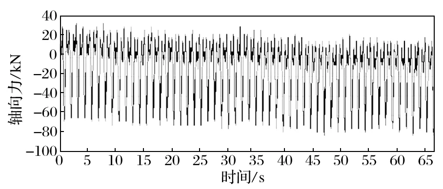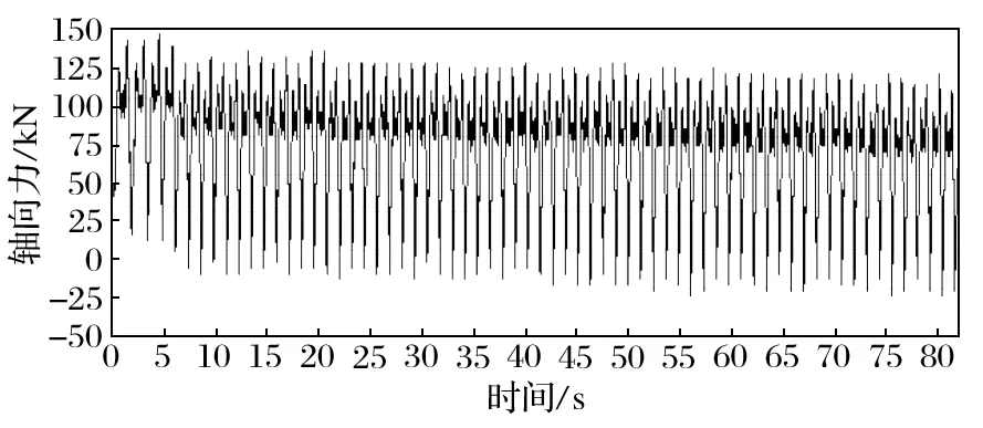 在左罐重載上提穩定運行過程中,軸向力的zui大值為 141.623 kN,zui小值為-30.038 kN,平均值為 69.656 kN;峰值出現在 171.60 kN 處,有效值為76.301 kN。在右罐重載上提穩定運行過程中,軸向力的zui大值為 35.705 kN,zui小值為-81.171 kN,平均值為-12.662 kN;峰值出現在 116.875 kN處,有效值為 30.942 kN。