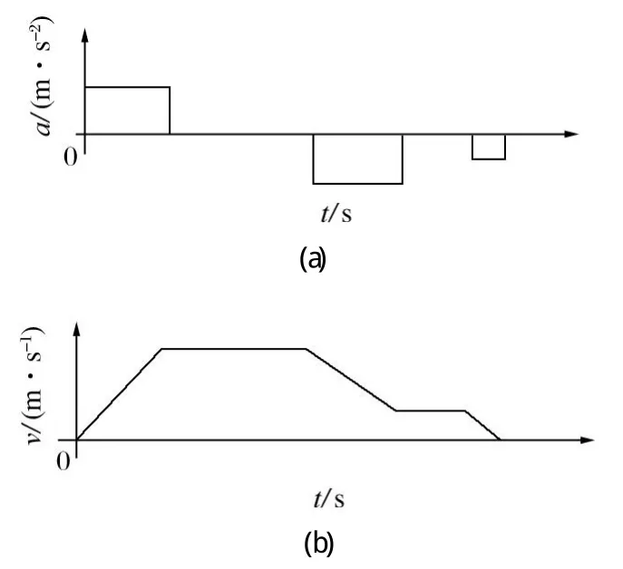 (4)重視提升系統沖擊限制,常用的有矩形加/減速度控制和梯形加/減速度控制,分別如圖1、2所示。采用梯形加/減速度控制曲線,并且加/減速度的變化率不宜大于 0.3 m/s3,以減少加/減速過程中提升鋼絲繩所受的動張力及彈性振動。新建礦井尤其是深井提升系統宜采用恒減速制動,可有效控制緊急制動過程中提升鋼絲繩的動張力,同時避免提升鋼絲繩打滑現象。