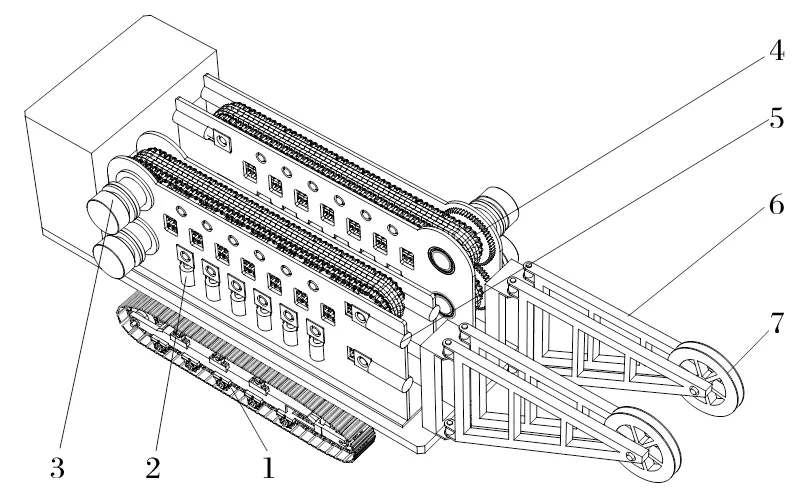 1.履帶行走機構;2.夾緊氣缸;3.液壓馬達;4.送繩機構;5.張緊氣缸;6.整車機架;7.導向輪。
